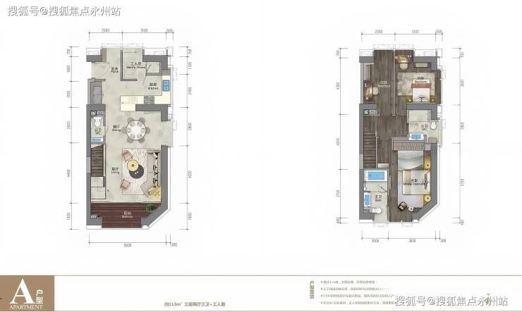 113㎡复式三房两厅三卫+工人房 南北通透三面景观,5.6米客厅与主卧开间,独具品位,尽享奢阔。
