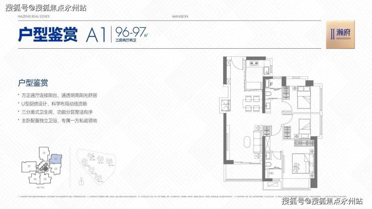 96-97㎡的3房2厅2卫,A1户型/2栋2单元02,设计的是竖厅格局,客厅3.5米开间,LDKB一体化,S墙设计预留冰箱卡槽位,动静分区,三开间朝南,双次卧东北向,U型厨房,公卫三段式分离,东南朝向。