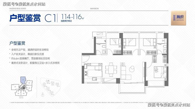 114-116㎡的4房2厅2卫,C1户型,设计的是横厅南北通透格局,客餐厅6.6米开间,LDKB一体化设计,四开间朝南,全屋7面飘窗,主卧套房+步入式衣帽间,3个次卧朝西北向,U型厨房,卫生间干湿分离,东南朝向。