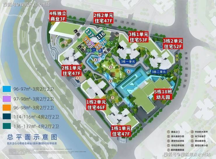 共由6栋总高46-53层的住宅组成,其中1栋1单元、2栋1/2单元47F,1栋2单元46F,3栋1单元53F,3栋2单元52F,5栋是1所18班幼儿园。