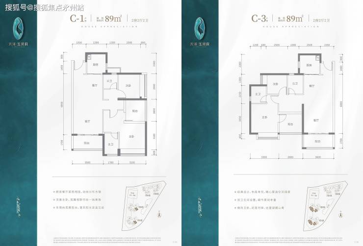 89㎡三房两厅两卫:竖厅或经典竖厅设计,客厅开间3.5-3.6米,部分户型可享茅洲河景观,房间宽度3.1-3.3米,公卫采用三段式分离,得房率90.6%-92.1%(含赠送)。例如C3户型动静分离,U型厨房,阳台进深1.7米。
