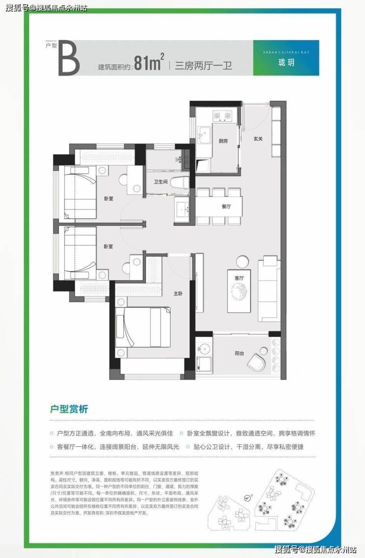 约81㎡三房一卫(1栋2单元05/06户型、3栋1单元03/04户型、3栋2单元02/05/06户型、5栋01/03/04户型)竖厅格局,餐客一体,动静分区结构,卫生间干湿分离设计,有东南朝向和西南朝向。