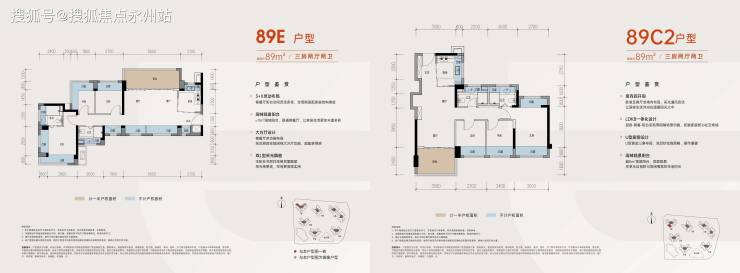 89㎡三房两厅两卫横厅E户型格局:南北通透,LDK一体化设计(客厅-餐厅-厨房-阳台连通),客餐厅开间达5.6米,搭配11㎡大阳台,主卧及次卧均带双飘窗设计。