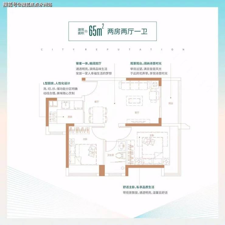 65㎡的2房2厅1卫:设计的竖厅格局,L型厨房,有朝西向及东向。