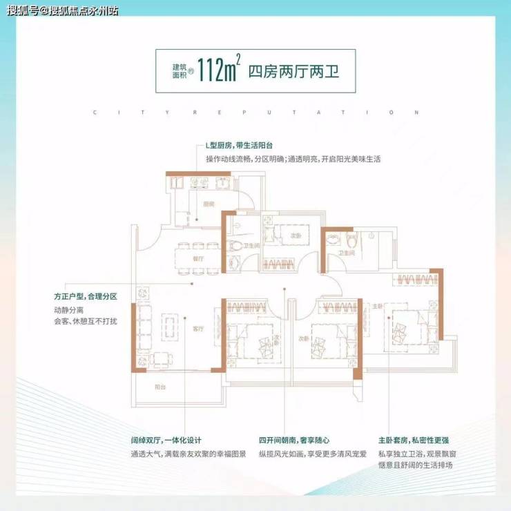 112㎡的4房2厅2卫:设计的竖厅格局,L型厨房,都是东南朝向。