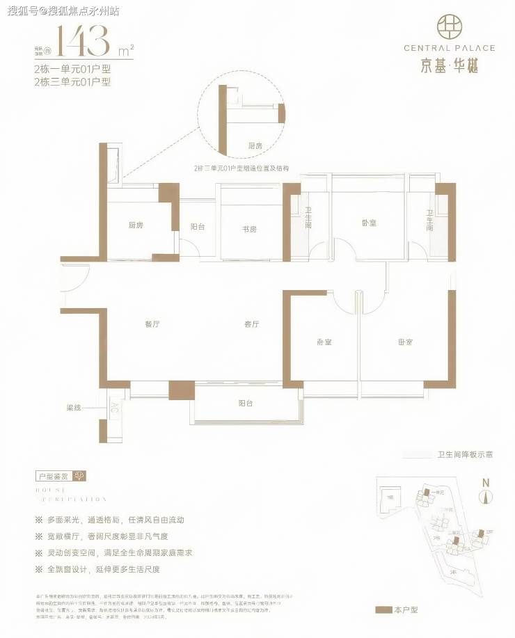 143㎡的4房2厅2卫,设计的是横厅南北通透格局,餐客厅一体化,四开间朝南,全屋飘窗,U型厨房,还带1个小生活阳台,卫生间干湿分离,得房率约73%(不含赠送),阳台主朝东南向。