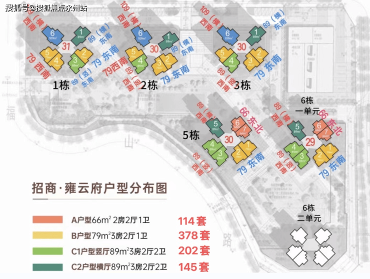 项目推售4个面积段,共计5种户型,分别是建面约67㎡两房两厅一卫;约79㎡三房两厅一卫;约89㎡竖厅三房两厅两卫;约89㎡横厅三房两厅两卫;约109㎡四房两厅两卫。