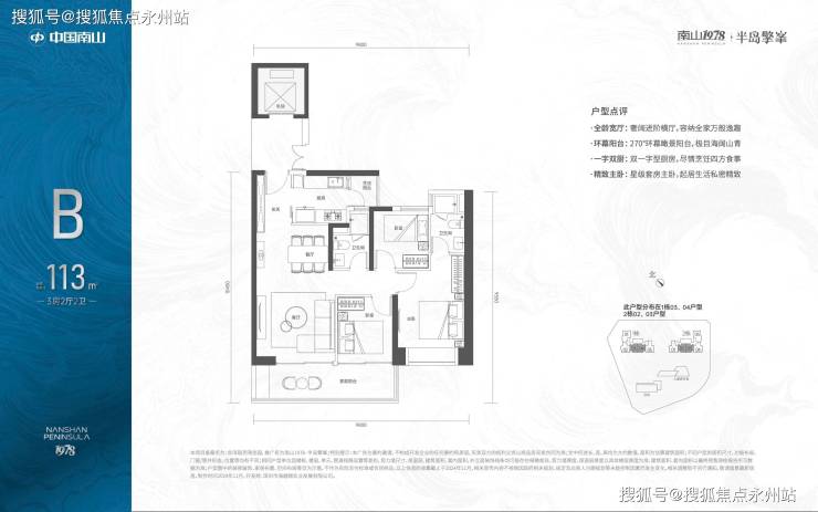 113㎡的3房2厅2卫:位于2-30F,全朝南向,带6.5米宽大阳台。