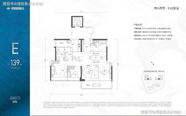 139㎡4房2厅2卫:位于32-43F高区,户数非常少,南向看海,独立电梯厅面积达到20㎡。