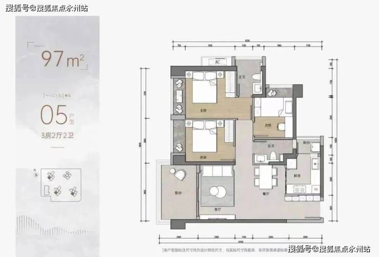 97平3房2卫的户型:客厅开间做到了3.6m而且阳台还不是承重墙,也就是说咱们的客厅还能往外推一些,做一个更大的公区。阳台东南朝向可看小区园林景观,西南侧则可以看到南山的山景景观,采光及通风效果都是非常优质的。