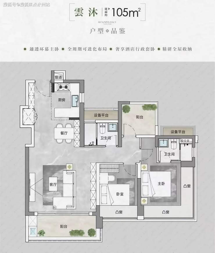 105㎡户型:这个户型的得房率比较高,赠送阳台可以改成房间,主卧飘窗是L型设计,而且中间没有承重墙,很好利用。