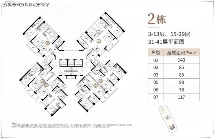 项目梯户比为3梯6户,所有户型的朝向均为东南或西南,户型分布如下图: