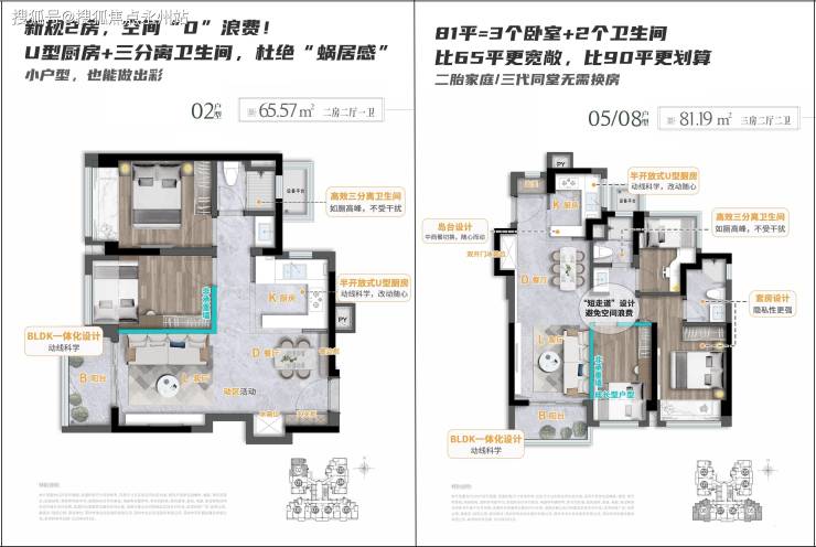 空间利用率革新丨LDKB 一体化设计:将客厅、餐厅、厨房、阳台(部分户型)整合为开放式空间,65㎡户型客厅开间2.95 米,81㎡户型达3.05米,通过减少墙体阻隔提升空间通透感。