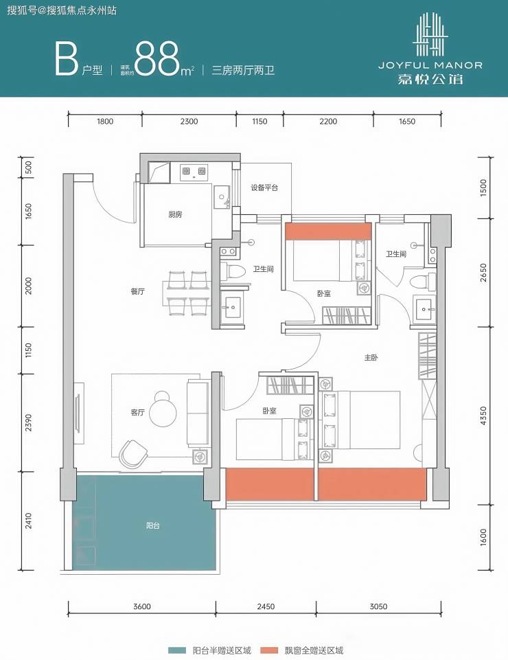 88㎡的3房2厅2卫,设计的是经典竖厅格局,客厅3.6米开间,LDKB一体化设计,三开间朝南,动静分区,3个卧室分别做到了主卧14.26㎡/次卧7.81㎡/次卧5.83㎡(包含墙体飘窗),客厅出8.67㎡的大阳台,U型厨房4.95平,公卫三段式干湿分离,得房率约86-90%(包含赠送),正南朝向。