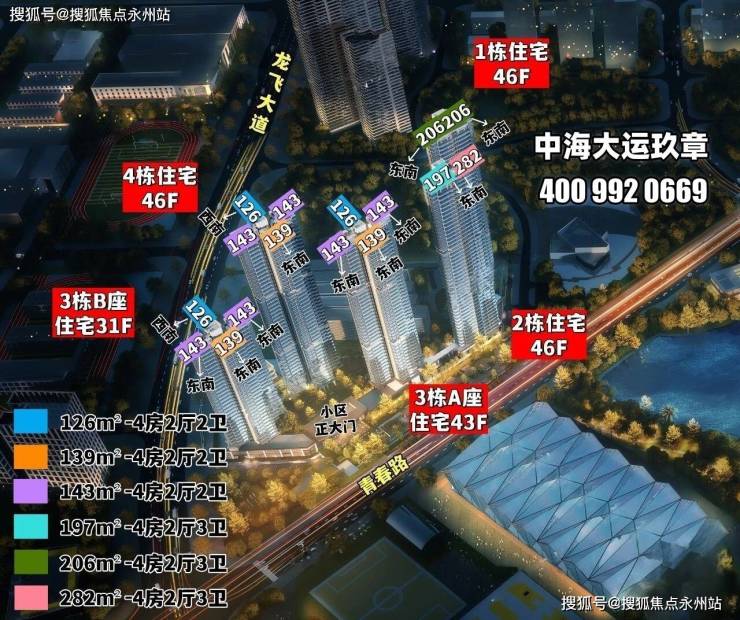 项目位于龙岗大运新城核心区域,紧邻龙飞大道与青春路交叉口东北侧,总占地面积2.08万㎡,总建筑面积15.66万㎡,容积率5.43,绿化率31.5%,规划5栋超高层住宅(31-46层)及1所幼儿园,总户数614户,车位比达1:1.73(1064 个车位),属区域内低密度高端社区。