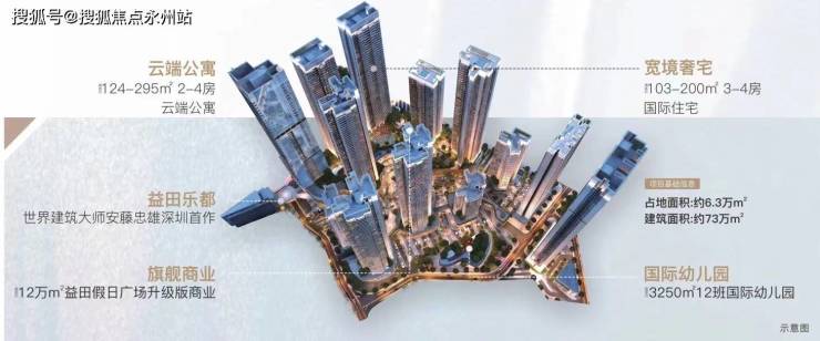 综合体:建面约73万㎡人文都汇综合体,集国际住宅、云端公寓、全新商业旗舰、益田乐都于一体,汇聚全球大师灵感,驭领城市发展潮流。