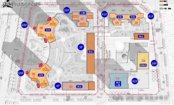 总栋数:8栋(1A栋42层酒店+公寓、1B栋28层保障房,2栋1/2单元41层住宅,3A/3B栋69层住宅;3C栋50层公寓、3D栋4层公寓)