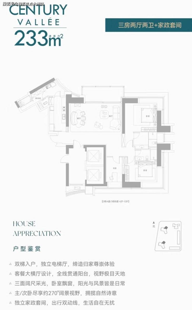 (住宅)【233㎡3+1房3卫】双梯入户,独立电梯厅,餐客大横厅贯通阳台,三面采光,主次卧尽享270°环幕视野,还有独立家政套间,西北朝向看名商和沙河高尔夫;