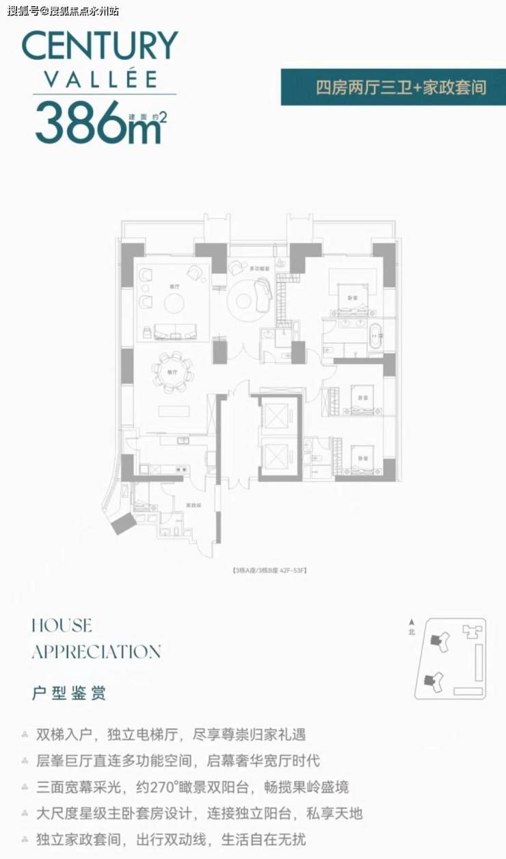 【386㎡4+1房4卫】双梯入户,独立电梯厅,阔绰横厅直连多功能空间,三面舒适采光,主次卧双套房,270°环幕视野,还有独立家政套间,西朝向看名商高尔夫和大河沙生态长廊。