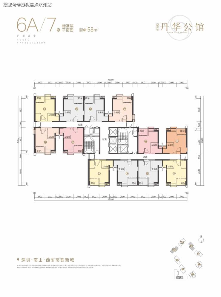 品字型,一层7户,约100㎡,3米层高,58㎡层高3.9米,局部隔两层可以做到3-4房,4T12户。101㎡层高2.95米,3T7户。