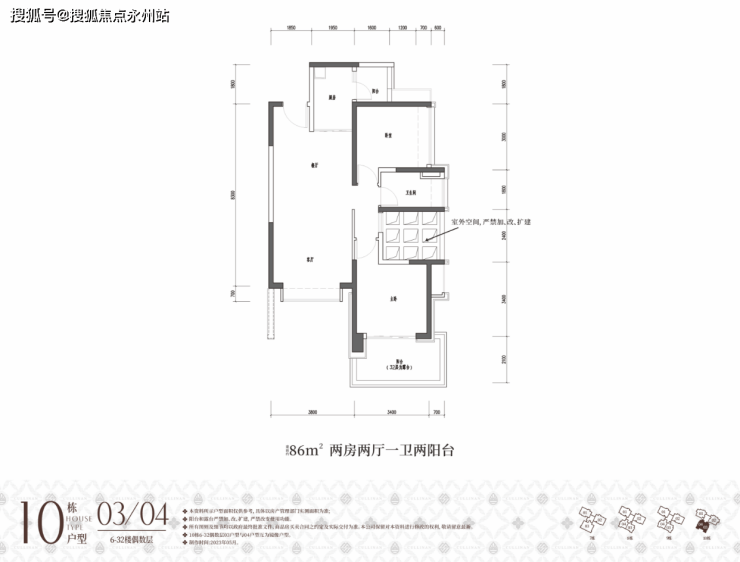 约86㎡两房一卫(10栋03/04户型)经典竖厅格局,餐客一体设计,带独立生活阳台,景观阳台连接客厅,西南朝向