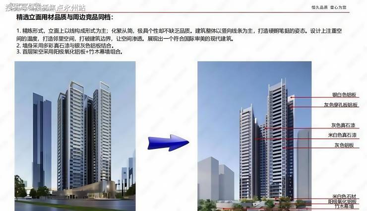 项目高阶立面,精炼形式,立面上以线构成形式为主;化繁从简,极具个性却不缺乏品质,展现出一个符合国际审美的现代建筑;墙身采用多彩真石漆与局部银灰色铝板结合,更加美观耐久,造就豪宅高端品质。