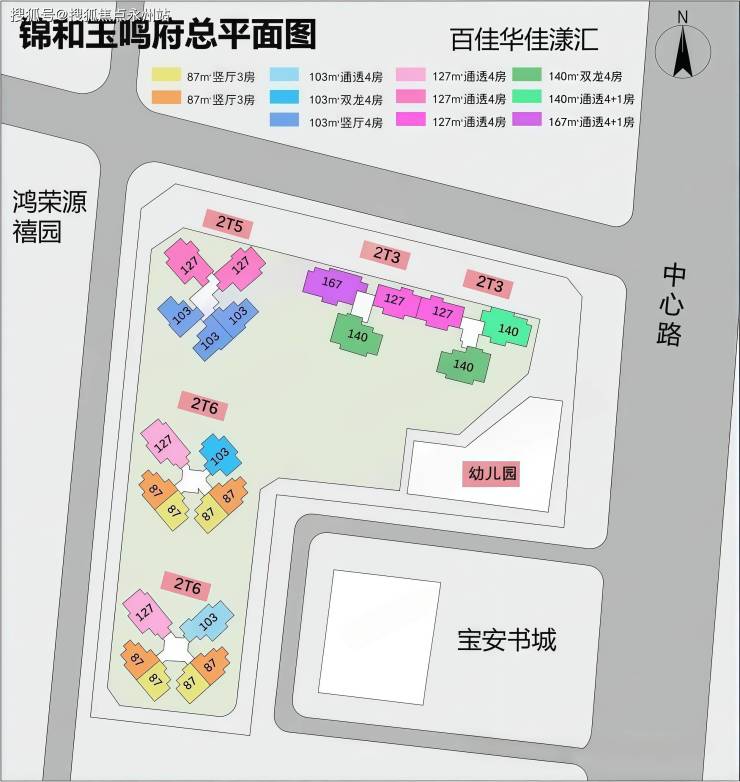 共规划5栋住宅,总户数约462户,由5栋23-26层住宅组成,采用2梯3户至 2梯6户的多样化设计,其中1/2/3栋住宅25层,5栋住宅24层,6栋住宅16层,4栋是1所9班制幼儿园,车位规划530个。