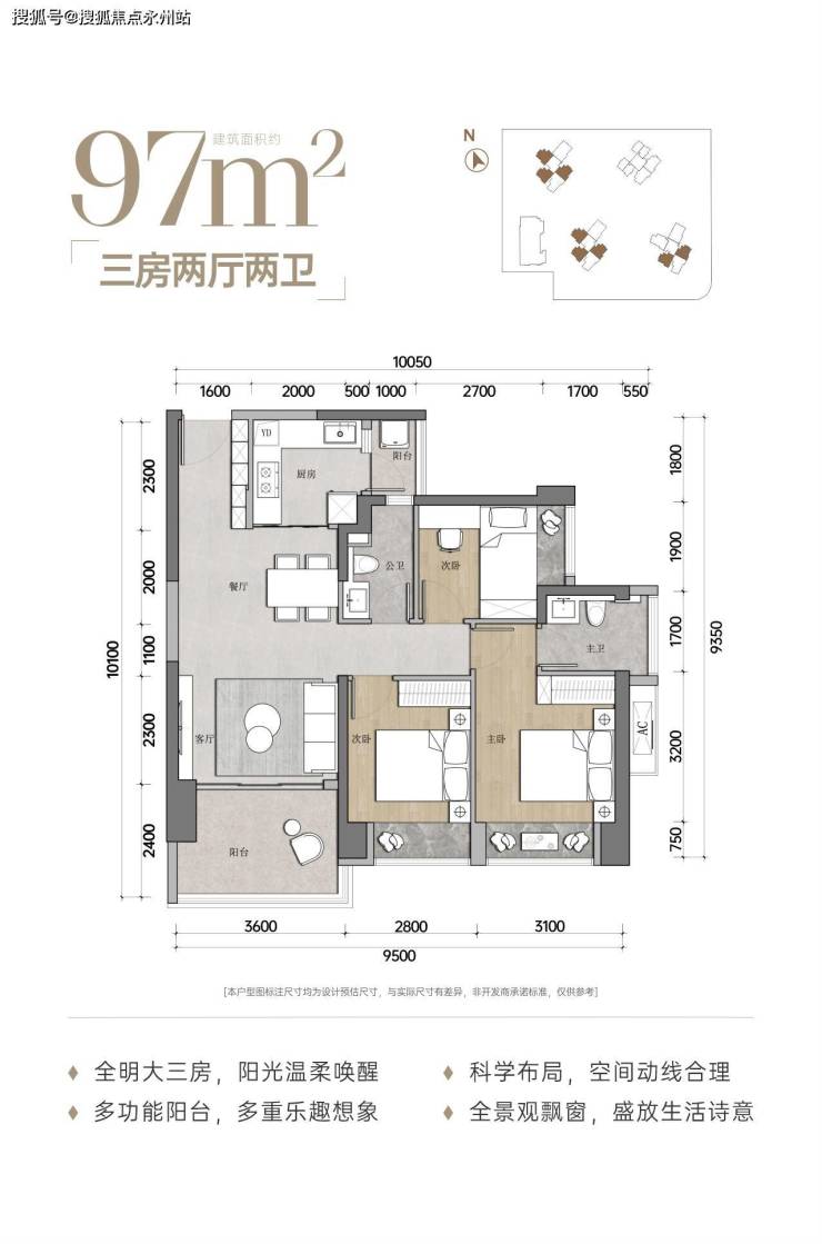 项目主力户型为97平方左右的3房2卫2卫,足有283套,占了一半之多。