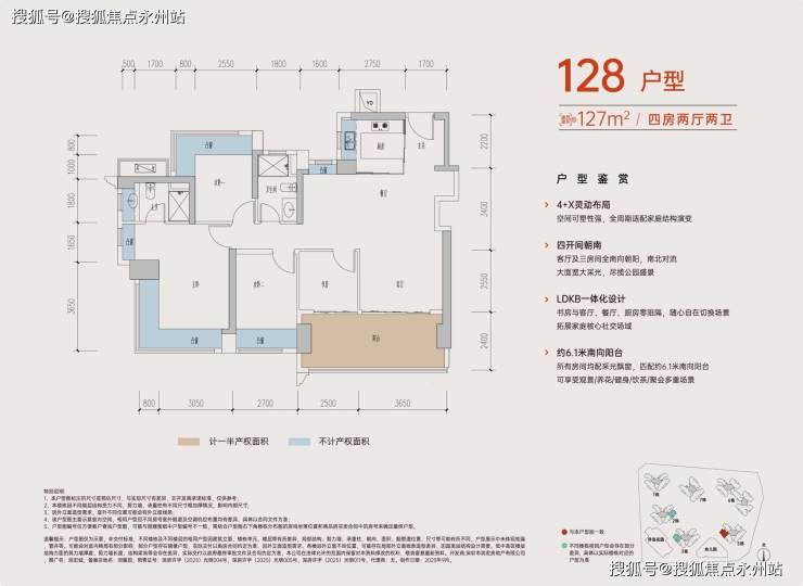 赠送率最高:赠送面积达21.54㎡,赠送率27%,得房率94.45%,套内使用面积约121㎡。