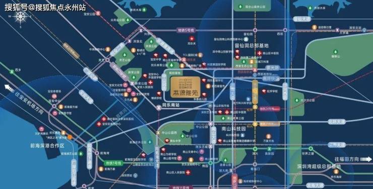 前海深港合作区(西南向约4km):定位国家战略性门户枢纽,未来将打造成世界级城市新中心,规划就业人口约65万人,居住人口15万人。