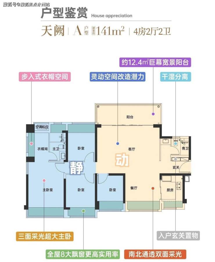 约114㎡4房2厅2卫:采用经典的双龙抱珠格局,客餐厅+阳台一体化设计,动静分区明确。