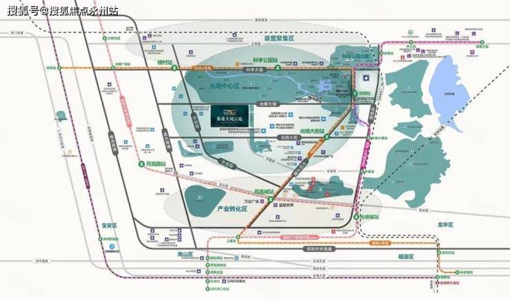 光明科学公园南侧光辉大道头排,仅规划2块纯居住用地,1块商住用地,其中地块A650-0385(R2纯居住用地)正是振业集团于2023年3月拍下的土地,罕有的一线景观资源地块,天赋卓越不可复制,未来难以再有。