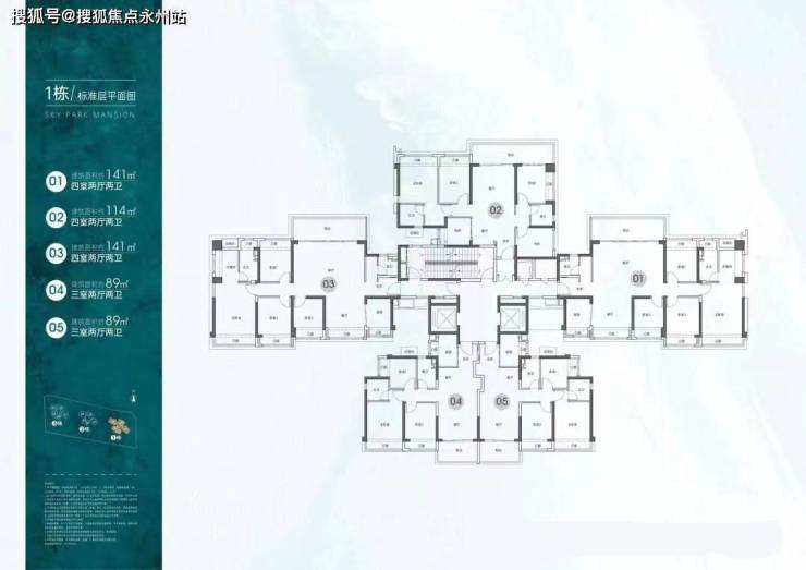 首推1栋,共165套房源,面积有89㎡的3房2厅2卫,114-141㎡的4房2厅2卫户型