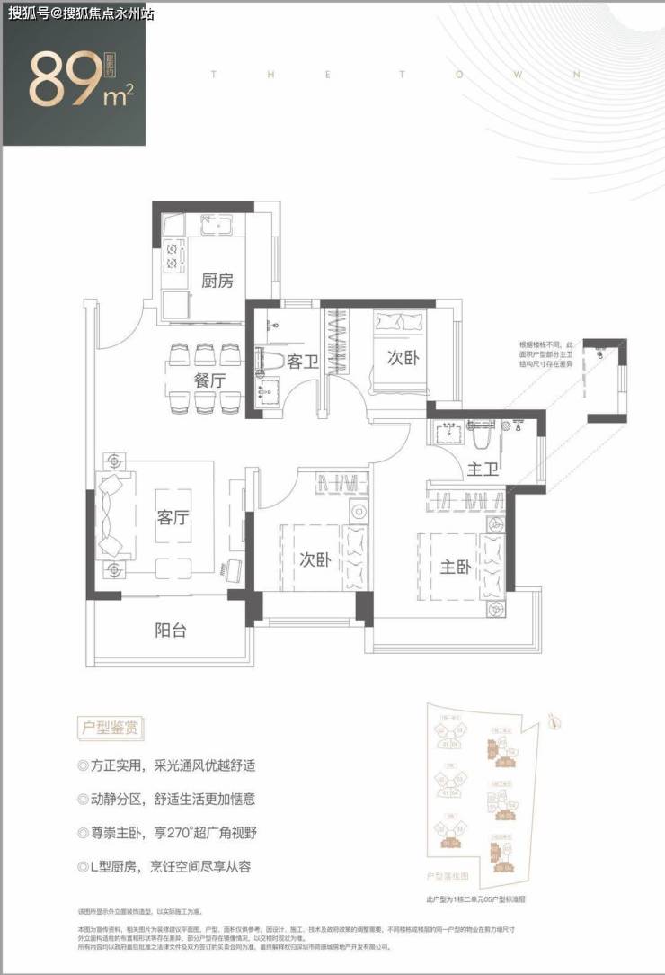 89㎡的3房2厅2卫,设计的是经典竖厅格局,客厅3.6米开间,LDKB一体化设计,动静分区,3个卧室分别做到了3.2米/2.7米/2.5米的宽度,主卧270°超广角视野,L型厨房,卫生间干湿分离,得房率:76.33%(不含赠送),有西北或西南朝向。