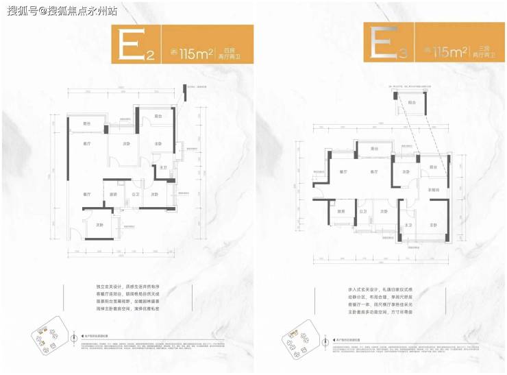 115㎡四房两厅两卫E2:户型东南和东北朝向,竖厅设计。不用改造,标准双阳台四房设计。和横厅115平相比,少一个面宽,赠送面积少了一个厨房飘窗和两个卫生间飘窗,套内实际使用面积估计会小一点。过道面积明显比横厅115的要大,空间利用效率会低一些。