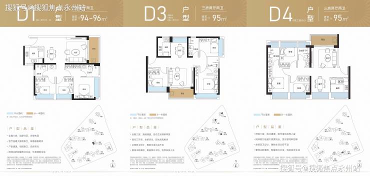 D3户型(95㎡):三开间朝南,“双龙抱珠”格局,阳台主朝东南/西南。