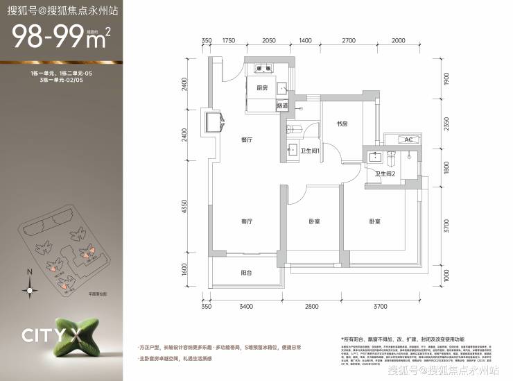 98㎡三房两厅两卫是项目的主力户型,分为西南向和东南向两种。该户型采用"四叶草"动静分区设计,客厅开间3.4-3.6米,主卧14.3㎡(含270°飘窗),得房率约85.65-86.96%。西南向房源折后总价378-387万,东南向房源389-404万,东南向房源因采光更好,价格高出约10-15万。