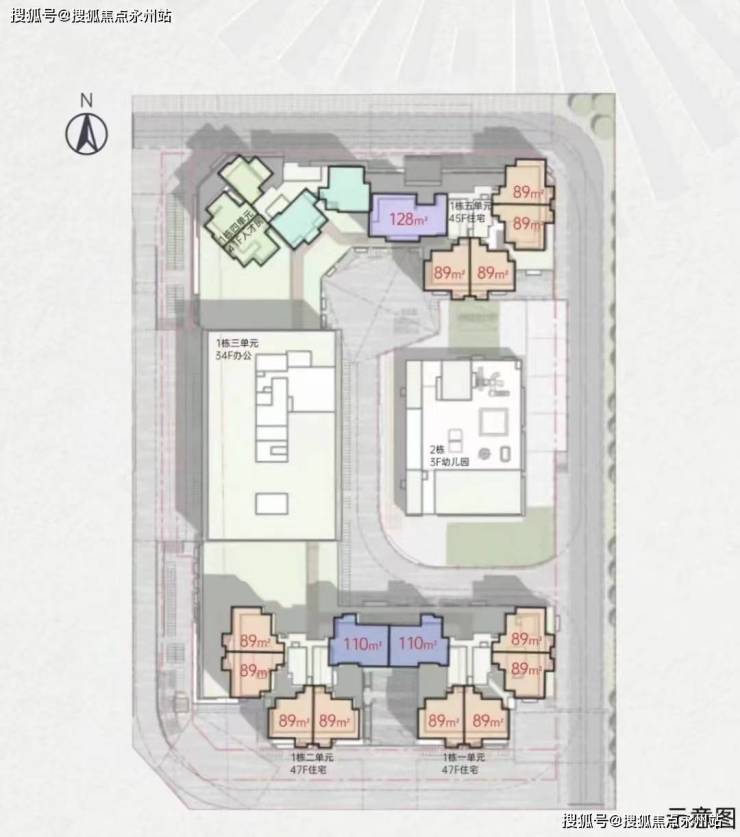 共由4栋住宅和1栋办公楼组成。1栋1、2单元为47层住宅, 5单元为45层住宅,共约615套住宅(含50套回迁房),3单元为34层写字楼,4单元为41层人才房,共180套人才房,2栋为3层幼儿园,4单元为41层人才房。