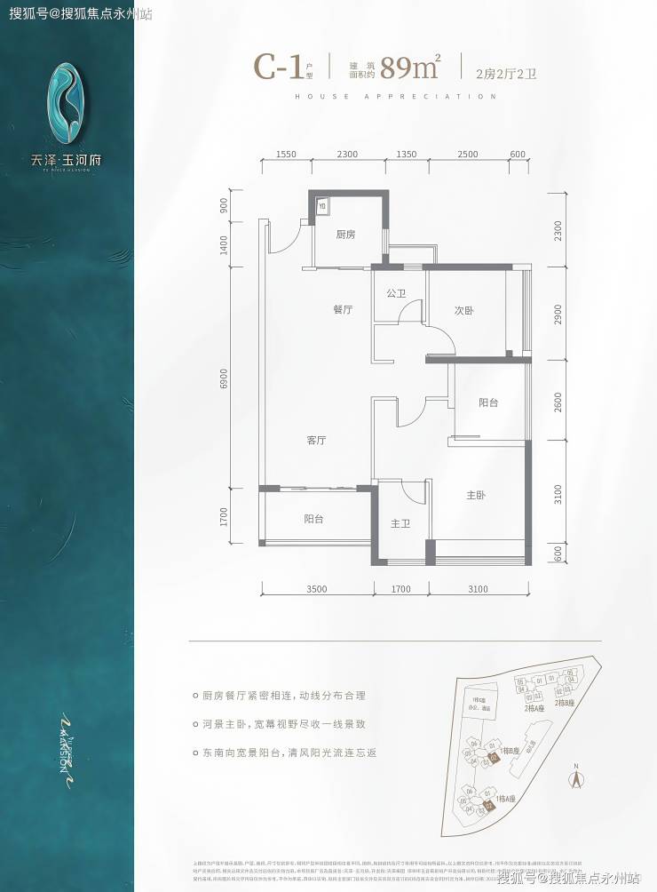 其他同面积户型:C2 户型(2 栋 A/B 座 02-03 户型):客厅开间3.5米,得房率 90.9%,东南朝向直面河景。