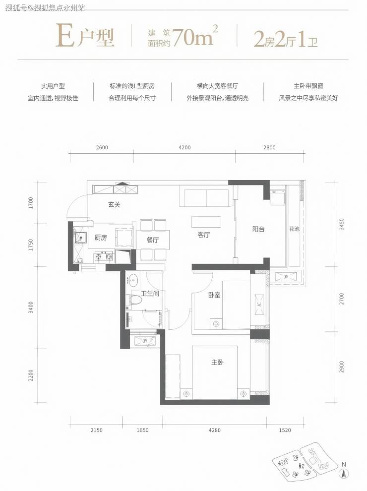 70㎡的2房2厅1卫,设计的是竖厅格局,客厅3.45米开间,进门玄关,LDKB一体化设计,,L型厨房,卫生间干湿分离,东向或西向。