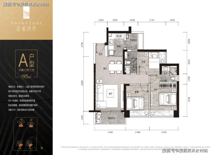 A户型95㎡3房2厅2卫:东南/西南朝向,竖厅,3.1米层高,双阳台,全凸窗设计,可以满足三口之家需求。