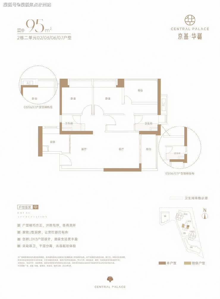 建面约 95㎡ 三房两厅两卫:竖厅格局搭配创新LDKB一体化设计(客厅、餐厅、厨房、阳台联动),L型厨房动线流畅,卫生间干湿分离。得房率约73%(不含赠送),阳台为东南或西北朝向,部分房源可享城市景观。