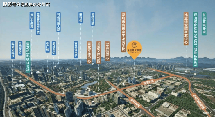项目紧挨着深圳高级中学龙岗学校,北侧是金众蓝钻,周边有占地25万㎡的龙湖公园,龙岗骨科医院,14号地铁线“宝龙站”距离约1.9公里,还有东部过境高速即将开通。