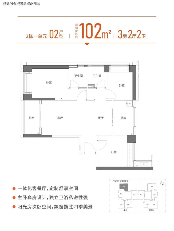 首推房源位于2栋一单元和二单元,3梯5户,总层高44层,建面约88㎡三房一卫,96-99㎡三房两卫,102㎡三房两卫。