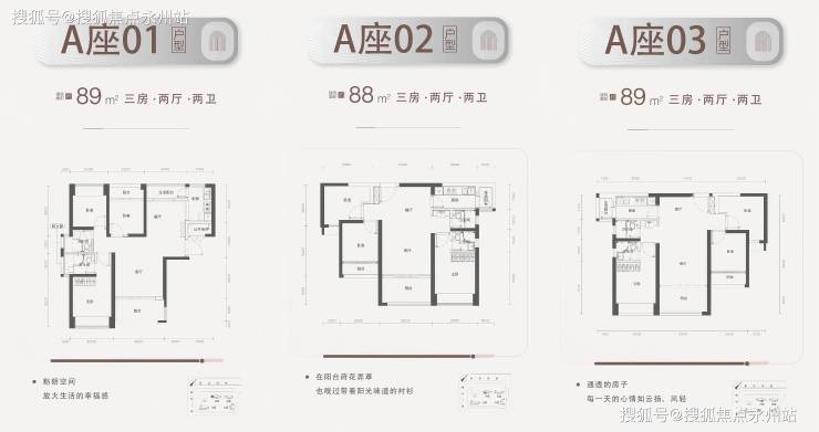 89㎡三房:三阳台配置,客厅阳台进深1.9-2米,部分户型配备生活阳台和次卧阳台,空间利用率高。