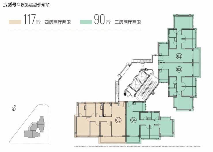 该户型为传统竖厅三房二卫设计,分布在01/02/04户,与常规的同面积户型没有太大区别,亮点在于主卧是个南北通设计。
