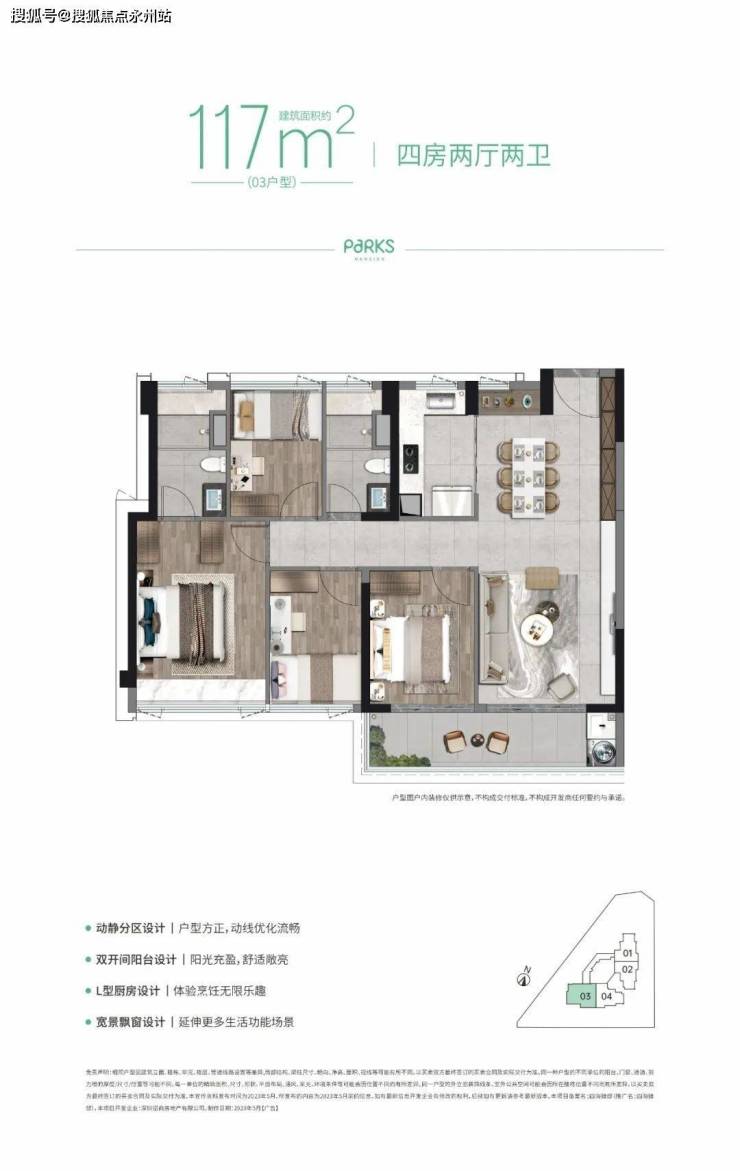 建面约90~117㎡3~4房臻品舒居,2梯4户舒适梯户比,使用率约73%。在产品上,全方位融入人性化设计理念,通过主卧套房、多方位飘窗等设计,演绎更多舒适生活场景。此外,建面约90㎡户型的客餐厅联通大面宽瞰景阳台,定制阳光宽境生活,建面约117㎡户型享双开间阔景阳台,收藏加倍阳光风景,打造孩子的阳光书吧、太太的花园、先生的休闲场。