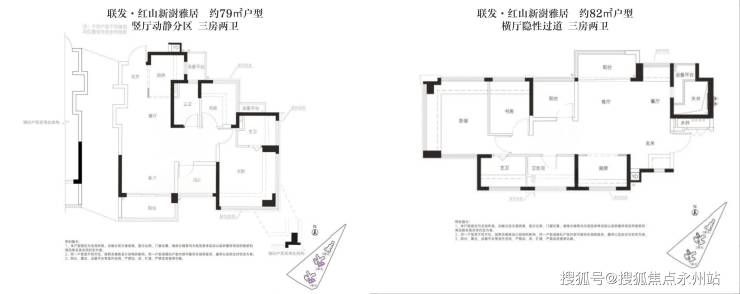 78-82㎡舒适三房配置,项目的主力产品,约占总户数的 70%。该户型有78㎡和 82㎡两种面积段,主要区别在于主卧套房的大小和阳台宽度。