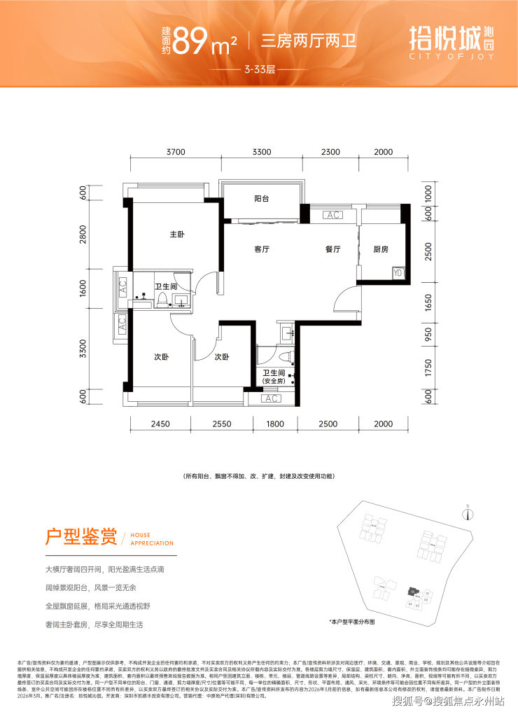 建面约89㎡ 三房两厅两卫,核心亮点:南北通透户型,采光通风俱佳,部分户型可享南向湖景,舒阔景观视野,主卧为套间设计,配备独立卫浴空间,保障居住私密性,户型布局合理,动静分区清晰,舒居三房设计,可满足三代人各有私密空间的需求,是刚需改善的优选户型。