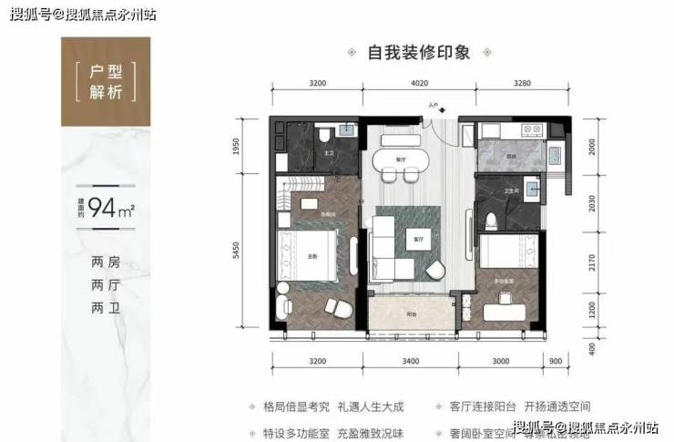 公寓94㎡2房2厅2卫:双龙抱珠,户型方正,实用率高,94平做到两房两卫,市场少有的产品,厅出阳台,3.15米层高,通燃气,舒适宜居,空间通透,卧室奢阔且私密